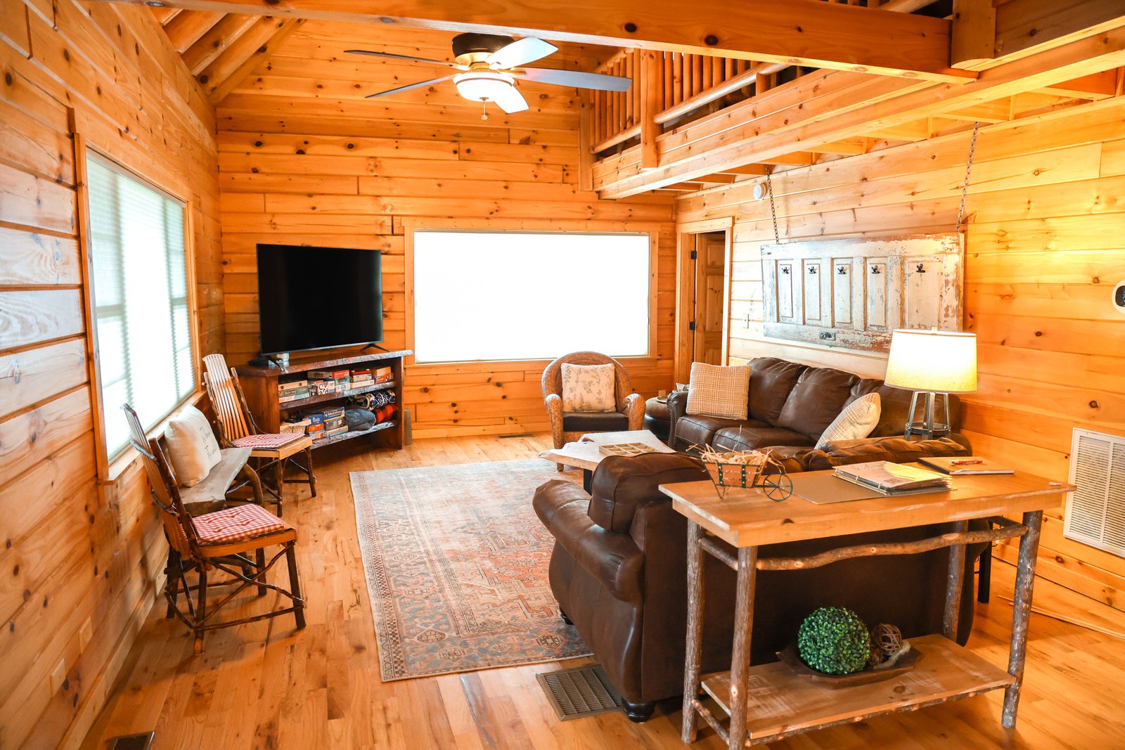The cabin sleeps up to 9 across two private king bedrooms on the main floor and a spacious loft upstairs - giving everyone their own space while keeping the whole group together where it counts. Inside, you'll find a fully stocked kitchen, a cozy den with a record player, a loft game room, and all the comforts of home without any of the noise that comes with it.