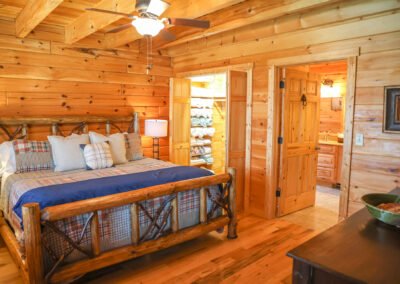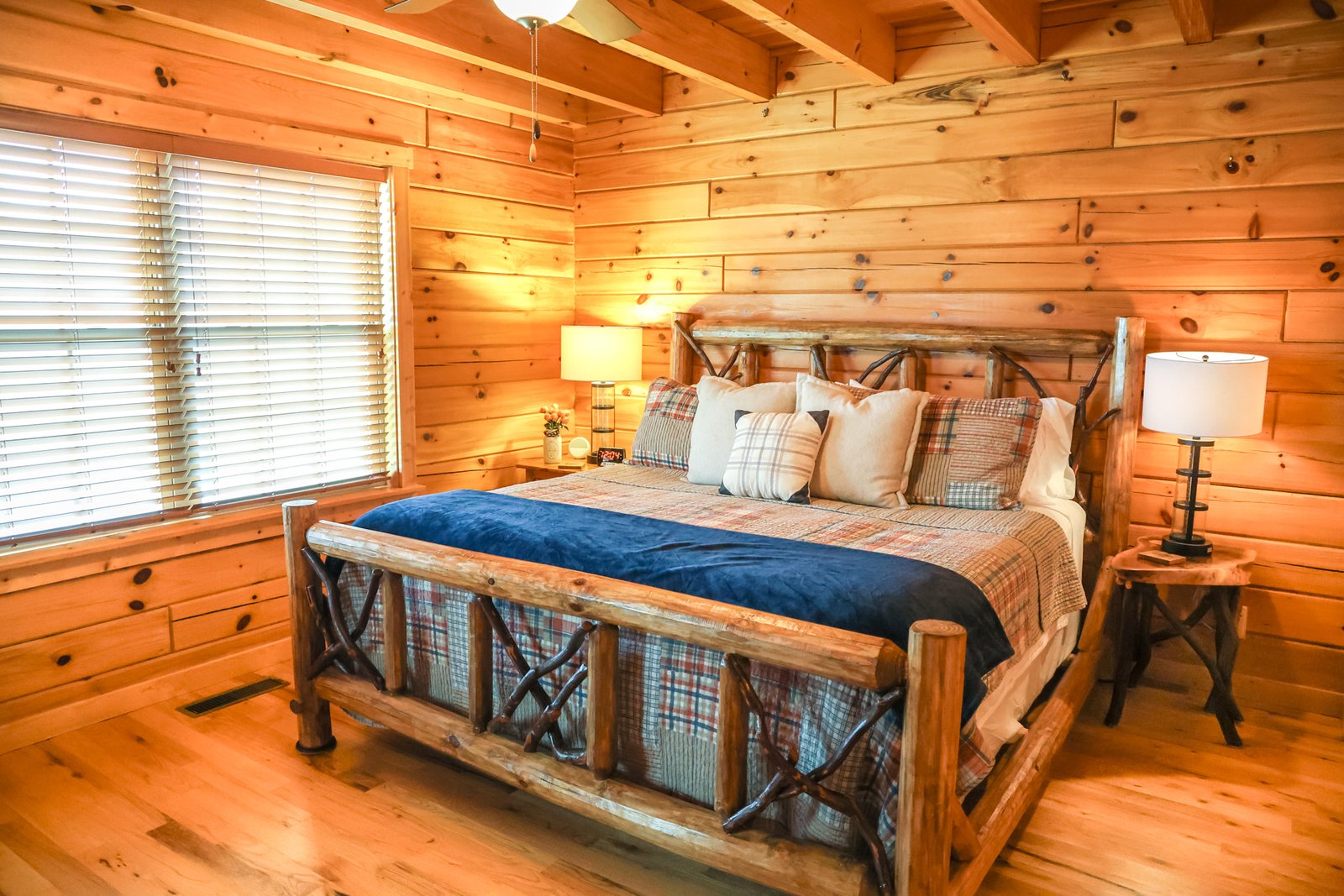 A private king retreat on the main floor designed for real rest, with room-darkening shades and the quiet that only 11 mountain acres can offer.