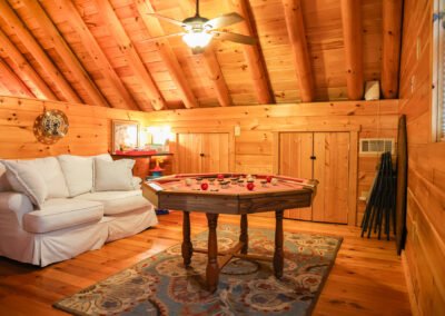 The loft lives by its own rules - part sleeping space with a twin bed, part hangout, part game room, and entirely its own thing. Upstairs and tucked away from the main floor, it's where the night owls land after the fire dies down and where the kids disappear to during the day. It sleeps two and holds more - and whether it's a board game marathon or a quiet morning with a book, the loft tends to become the unexpected favorite room of the trip.
